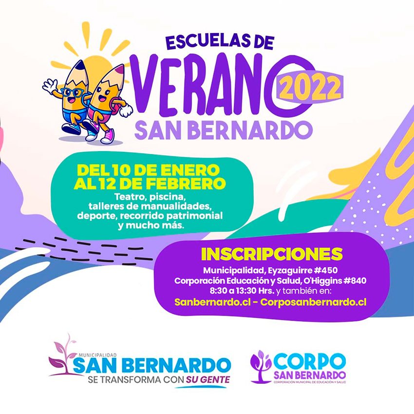 Ofrecer espacios seguros y amables a los niños, niñas y adolescentes de San Bernardo es lo que buscan las Escuelas de Verano que realizará por primera vez nuestro municipio. La iniciativa se extenderá entre el 10 de enero y el 12 de febrero y se implementará en diez establecimientos educacionales municipales, una semana cada uno, de manera gratuita.
