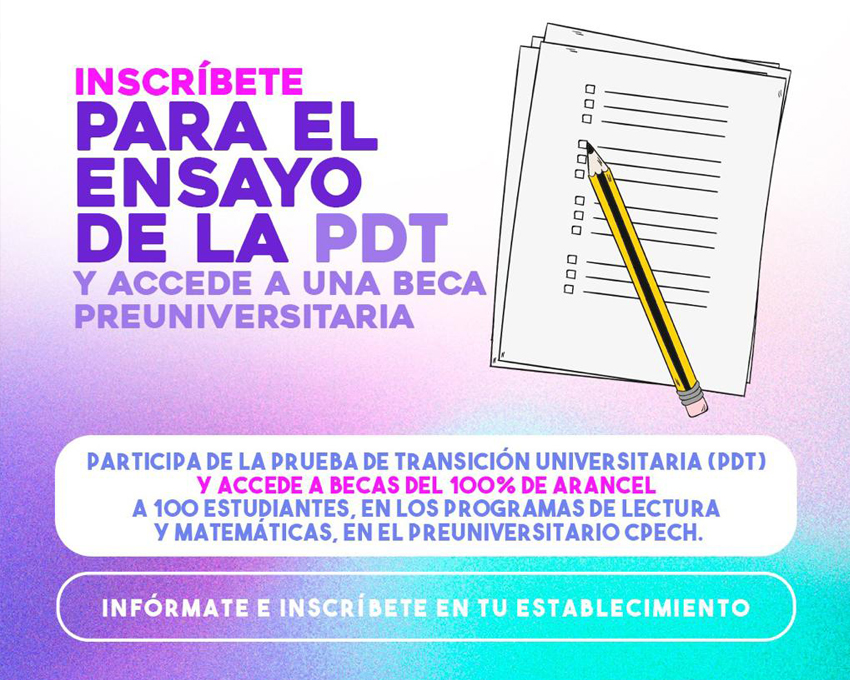 Invitamos a las y los estudiantes de 4° medio y segundo nivel medio, de los establecimientos municipales de San Bernardo, a inscribirse en su liceo y participar del ensayo diagnóstico de la Prueba De Transición Universitaria (PDT), a realizarse los días viernes 22 y sábado 23 de abril.