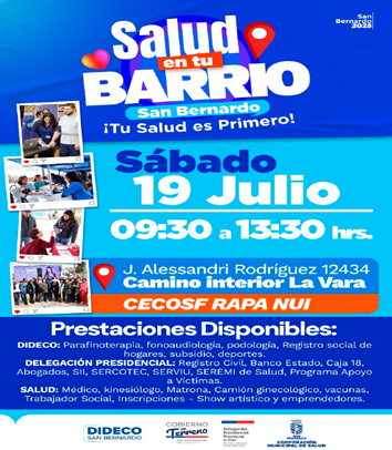 La Ilustre Municipalidad de San Bernardo, en conjunto con la Corporación Municipal de Salud, invita a todos los vecinos y vecinas de Villa La Vara a participar en una nueva versión del operativo “Salud en tu Barrio”, que se realizará este sábado 19 de julio, a partir de las 09:00 horas, en calle Jorge Alessandri N°12434, Camino Interior.